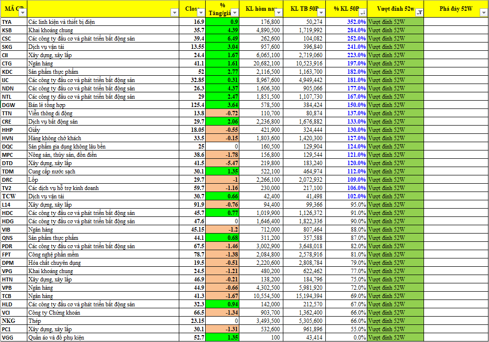 Danh sách cổ phiếu vượt đỉnh 52 tuần có xu hướng mở rộng, nhưng nằm trải dài ở các nhóm ngành. Cụ thể hơn là sự phân hóa, dòng tiền tập trung ở một số cổ phiếu như: KSB,CTG, NTL,DGW, CSC, …..
