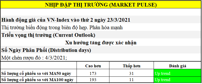Xu hướng thị trường vẫn đang ở “XU HƯỚNG TĂNG ĐƯỢC XÁC NHẬN” với 1 phiên phân phối. Nhóm ngành ngân hàng phân hóa mạnh, tăng giảm trái chiều trong đó nổi bật với cổ phiếu CTG đã break đỉnh 52 tuần và tăng mạnh đã làm động lực lan tỏa đến những cổ phiếu khác. Trong khi ông lớn VCB đang “chật vật” tìm lại chính bản thân mình là cổ phiếu dẫn dắt nhóm ngành ngân hàng. Tuy nhiên cần lưu ý VCB đang có giá đóng cửa dưới MA50 ngày và đang hình thanh xu hướng giảm. Số lượng cổ phiếu trên MA50 ngày vẫn đang chiếm ưu thế và danh sách cổ phiếu vượt đỉnh 52 tuần tăng mạnh. Đây là dấu hiệu tốt để củng cố hơn cho xu hướng tăng của thị trường.