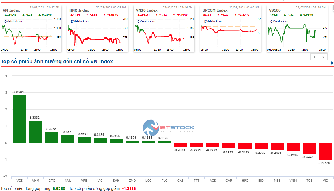 Kết thúc phiên giao dịch ngày 22/3/2021 chỉ số VNIndex đóng cửa ở 1,194.43 điểm, tăng 0.38 điểm, tương ứng tăng 0.03%. Thanh khoản thị trường đạt hơn 626 triệu đơn vị. Nhóm cổ phiếu ngân hàng phiên hôm nay kiềm hãm đà tăng của thị trường, điều này đã làm thị trường “lỡ hẹn” ở mốc 1200 điểm thêm 1 lần nữa. Điểm sáng của thị trường phiên hôm nay chính là dòng cổ phiếu liên quan đến FLC, ROS, ART,… Đặc biệt là cổ phiếu FLC với phiên giao dịch hơn 45 triệu cổ phiếu với mức giá đóng cửa cao nhất trong phiên đã làm dòng tiền hút mạnh về những công ty liên quan đến FLC.