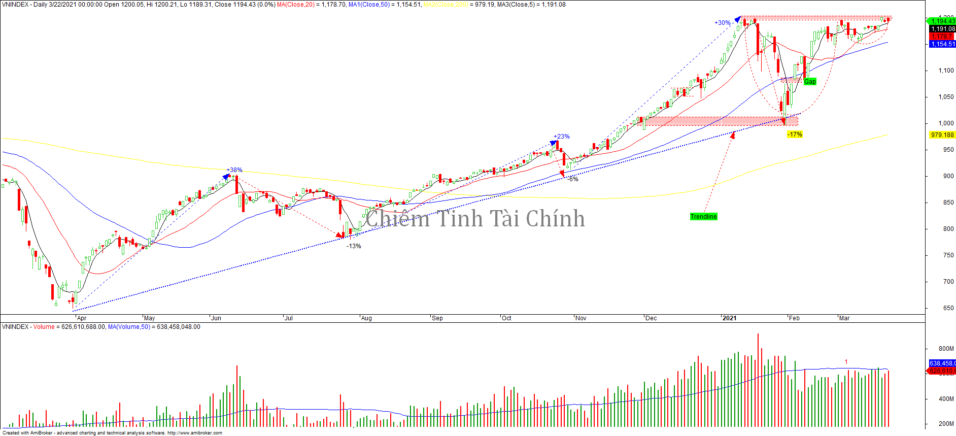 Tinh đến thời điểm hiện tại chỉ sơ VNIndex đã có gần 5 tuần tích lũy ở phần tay cầm, tuy nhiên phía mạn trái chiếc cốc nguồn cung vẫn còn khá nhiều làm việc hấp thu ở phía tay cầm cần nhiều thời gian hơn. Thị trường đang tiến gần mốc 1200 điểm, sự thiếu đồng thuận giữ các nhóm ngành đặc biệt ở nhóm ngành “Ngân hàng” đã làm việc “Chinh phục “ mốc 1200 điểm trở nên khó khăn hơn. Đây cũng là lần thứ 3 mà chỉ số VNIndex tiến gần mốc 1200 điểm kể từ đầu năm 2021 đến thời điểm hiện tại. Chỉ số VNIndex đã có hơn 50 tuần tăng giá kế từ đáy hồi tháng 4 năm 2020, thường ở vùng 50 tuần với biên độ 44 đến 56 tuần thị trường sẽ có nhiều biến động mạnh trong việc chuyển giao pha.
