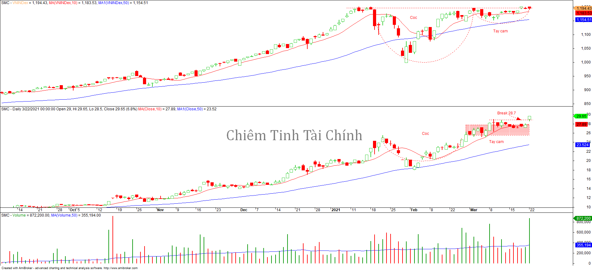Điều này thể hiện rõ ở phiên 22/3/2021 khi cổ phieeuis mở Gap up tăng mạnh đi kèm với khối lượng tăng mạnh gần gấp 3 lần bình quân 50 phiên. Cổ phiếu vừa mới thoát ra khỏi mẫu hình “Cốc tay cầm ” ở nền giá số 2.