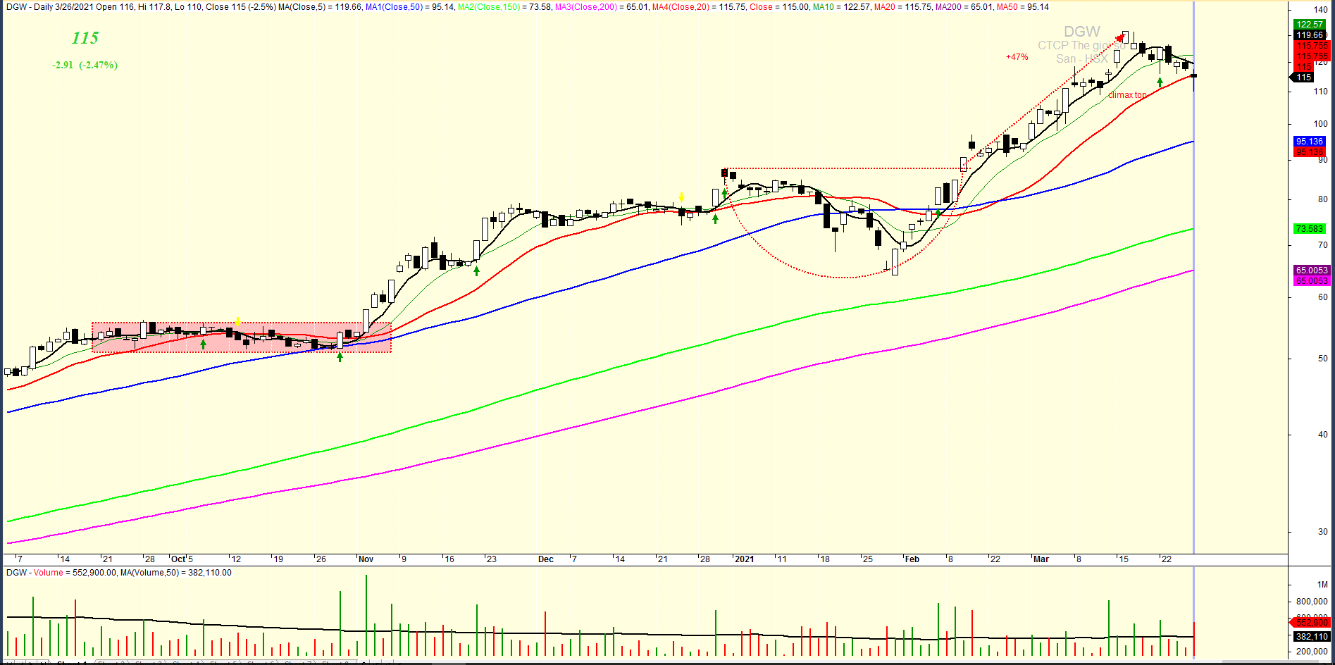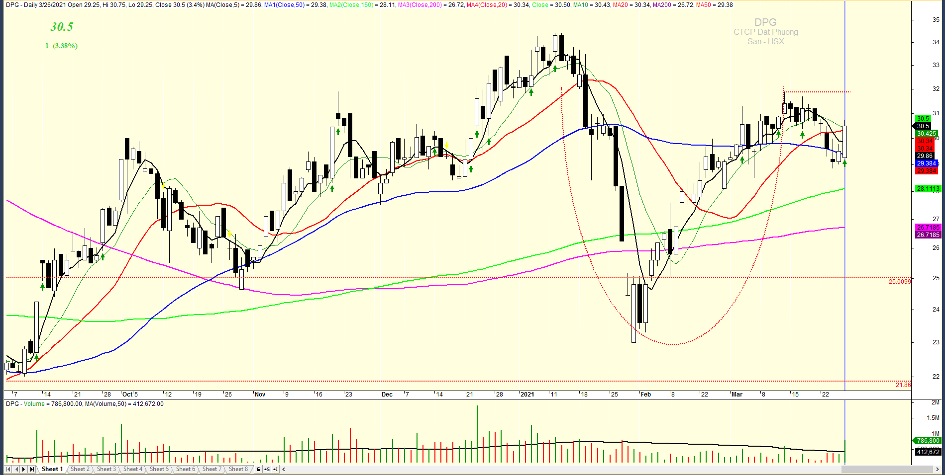 Theo hệ thống CANSLIM, DPG đã xuất hiện điểm mua Pocket Pivot vào ngày 26/3/2021 – một điểm mua sớm bên trong nền giá, chúng tôi tiến hành quay trở lại thăm dò tỷ trọng 3% ở cổ phiếu này sau khi đã cutloss ở điểm mua trước đó (cổ phiếu DPG đã được chúng tôi hiện thức hóa lợi nhuận ở giai đoạn trước và chỉ mở mua mới ở giai đoạn sau). Mẫu hình mà chúng tôi đang quan sát ở DPG là mẫu hình Cốc tay cầm. Hiện tại chúng tôi đã có báo cáo chi tiết về cổ phiếu DPG và gửi đến nhóm khách hàng thuộc nhóm Zalo Nhà đầu tư CANSLIM. Bạn đọc có thể liên hệ chúng tôi để có những báo cáo phân tích cổ phiếu được cập nhật chi tiết sớm nhất qua SĐT 0977.697.420