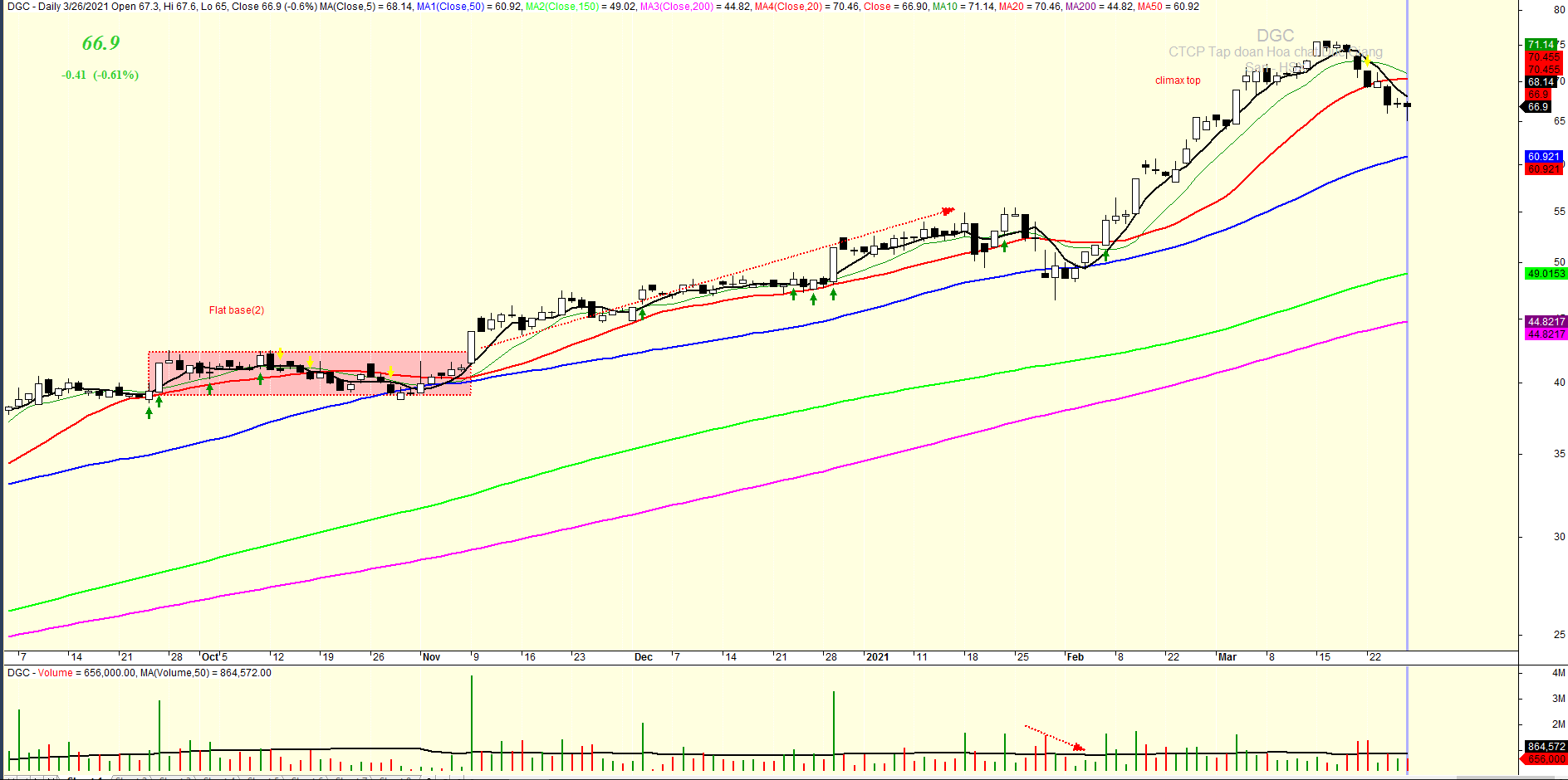 Cổ phiếu DGC sau cú chạy Climax đã giảm phá thủng M20 ngày với khối lượng lớn đồng thời đang tiến về khu vực hỗ trợ MA50 ngày.