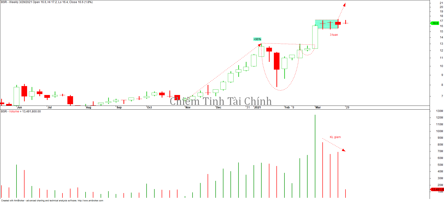 Trên đồ thị tuần của BSR sau khi Break mẫu hình “Cốc tay cầm” cổ phiếu BSR đã tăng hơn 31% và đang hình thành nền giá phẳng 3 tuần thắt chặt , hiện tại cổ phiếu đang giao dịch ở tuần thứ tư.