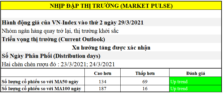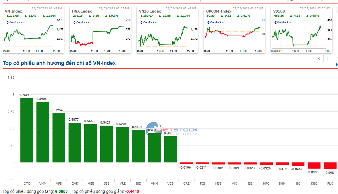 Kết thúc phiên giao dịch ngày 29/3/2021 chỉ số VNIndex đóng cửa ở mức 1,175.68 , tăng 13.47 , tương ứng tăng 1.16%. Thanh khoản thị trường đạt 592 triệu đơn vị . Nhóm ngân hàng tăng mạnh kéo thị trường tăng hơn 13 điểm tâm điểm như CTG, VCB,HDB, SHB…. Thị trường phân hóa khá mạnh giữa các nhóm ngành trong khoảng thời gian chuẩn bị công bố báo cáo tài chính quý 1 năm 2021.