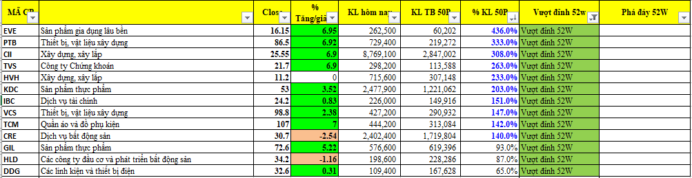 Danh sách cổ phiếu Break đỉnh 52 tuần vẫn chưa có dấu hiệu mở rộng so với phiên ngày 26/3/2021. Đây là điều cũng dễ hiểu khi đây là thời điểm gần công bố báo cáo tài chính quý 1 năm 2021, nhiều cổ phiếu đang chờ chất xúc tác từ kết quả kinh doanh để bùng nổ, nhà đầu tư cũng nên thận trọng về vị thế nắm giữ cổ phiếu trước thềm báo cáo tài chính.