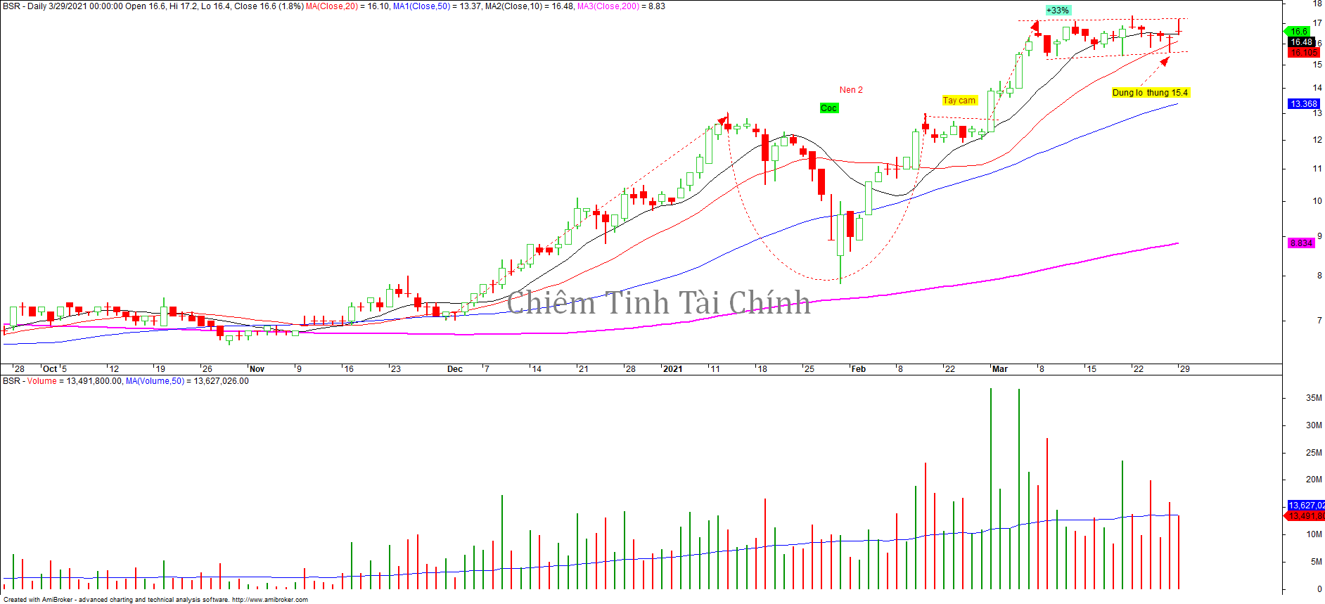 Chi tiết hơn trên đồ thị ngày, cổ phiếu BSR đang hình thành nền giá phẳng khá thắt chặt, điểm Break của mẫu hình nền giá phẳng ở vùng 17. Cổ phiếu vừa mới thoát ra khỏi nền giá 2 với mẫu hình cốc tay cầm. Đây là vùng có thể bổ sung vị thế đối với BSR.