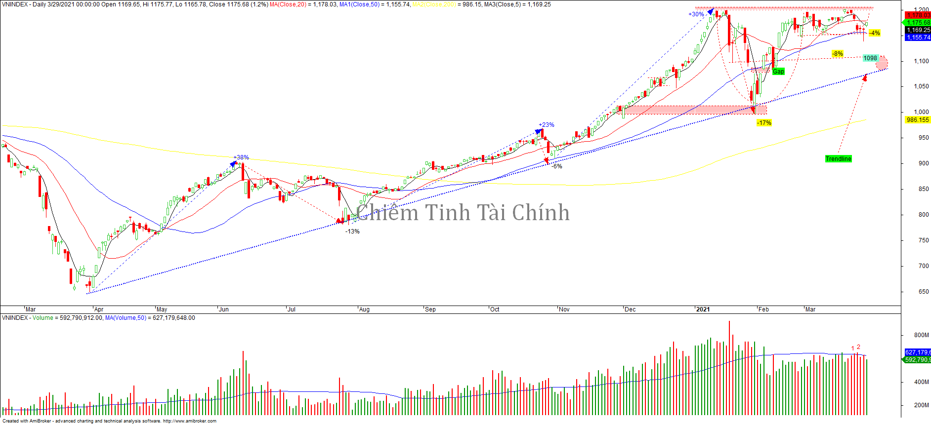 Hành động giá của VNIndex phiên ngày 26/3/2021 đã cho thấy sức mua lấn áp bên bán và thể hiện bằng cây nến Pin bar kéo lên cuối phiên. Và kết quả sau đó là phiên ngày 29/3/2021 chỉ số VNIndex tăng hơn 15 điểm. Thanh khoản thấp hơn phiên ngày 26/3/2021 cho thấy tâm lý e ngại của nhà đầu tư sau cú giảm hơn 50 điểm đã tạo ra tâm lý “e ngại” cho nhà đầu tư, mỗi khi thị trường tiến về mức 1200 điểm là nỗi đau của nhà đầu tư được nhắc lại và gợi lại niềm đau như “vết dao” cắt vào da.