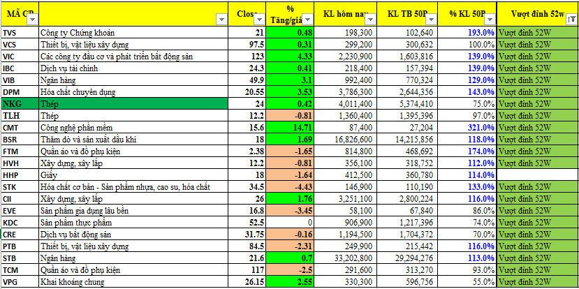 Hôm nay, số lượng cổ phiếu vượt đỉnh 52 tuần tiếp tục gia tăng khá mạnh, các cổ phiếu vượt đỉnh đa phần đều đến từ sóng ngành Thép, BĐS, ngân hàng, dầu khí, phân bón, dệt may,…