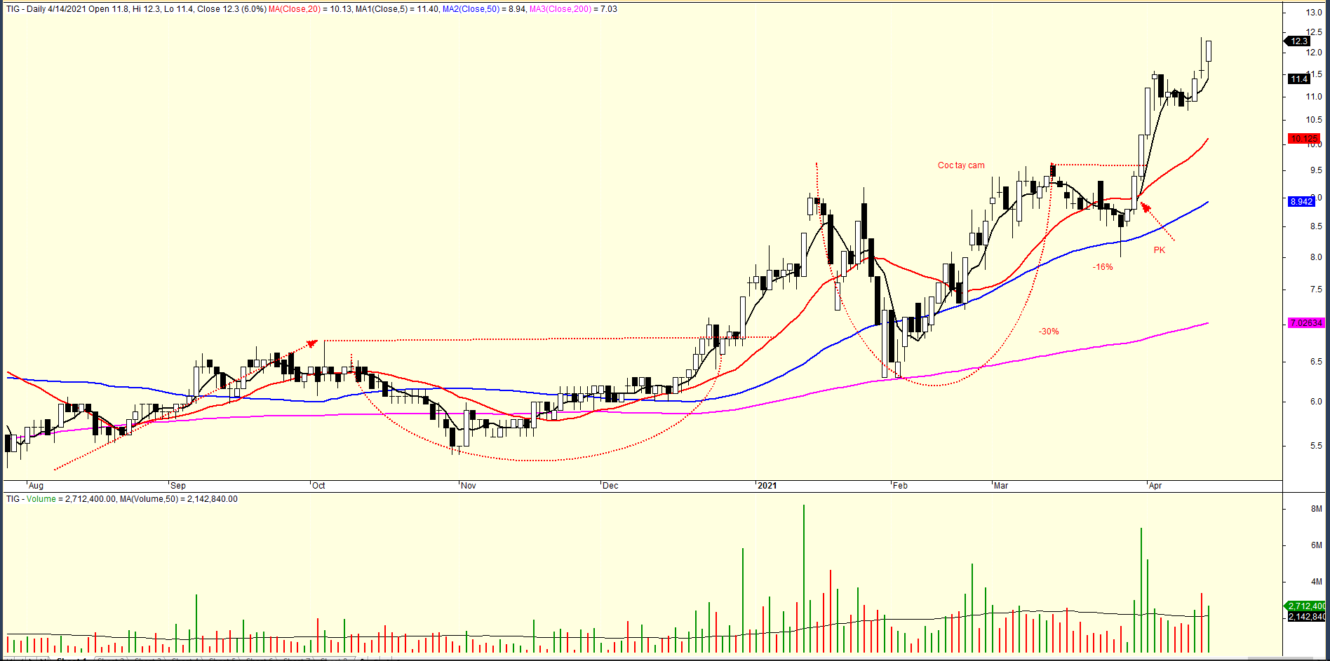 Cổ phiếu TIG tiếp tục đà tăng giá mạnh mẽ với khối lượng lớn sau điểm phá vỡ Mẫu hình Cốc tay cầm hoàn hảo. Một khoản lợi nhuận kha khá đã được chúng tôi và hệ thống khách hàng ở nhóm Zalo Nhà đầu tư CANSLIM bỏ túi chỉ trong vỏn vẹn 3 ngày.