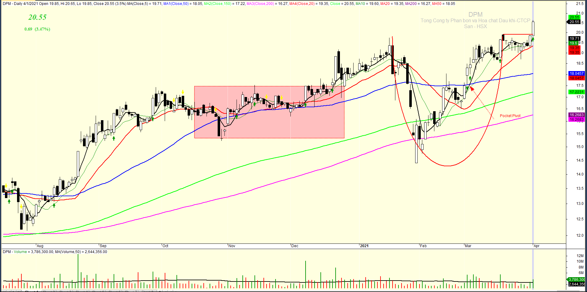 Theo hệ thống CANSLIM, DPM hôm nay có điểm mua breakout Mẫu hình Cốc tay cầm. Thời gian hình thành mẫu hình 9 tuần. Chúng tôi quay trở lại mở mua vị thế với tỷ trọng 5% khi tiến hành chốt lợi nhuận ở điểm mua Pocket Pivot trước đó (đã thông báo cho Khách hàng của chúng tôi ở nhóm Zalo Nhà đầu tư CANSLIM- Liên hệ 0977.697.420) . Hiện tại, DPM đang ở nền giá số 1.