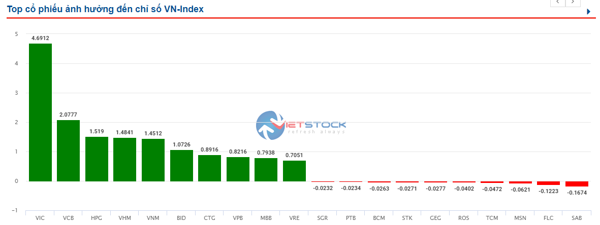 Chỉ số VN-Index tăng 2.06% với thanh khoản hôm nay đạt 637 triệu đơn vị, thấp hơn so với phiên trước. Một phiên giao dịch bùng nổ và đầy cảm xúc thật sự đã phá đi mọi sự nghi ngờ cho cơ hội vượt đỉnh 1200 điểm của chỉ số VN-Index. Không cần mong chờ và hy thêm nữa, tất cả mọi điều mà chúng ta đang cảm thấy bây giờ chỉ gói gọn trong hai chữ “TUYỆT VỜI”. Dẫn dắt cho đà tăng điểm hôm nay là đầu tàu nhà họ Vin, cổ phiếu VIC của nhà Vingroup hôm nay tăng điểm khá ấn tượng (+4.3%), VHM (+1.73%), VRE (+3.5%),… Đóng góp cho ngày bùng nổ của chỉ số VN-Index không thể không kể đến các cổ phiếu thuộc dòng ngân hàng với đà tăng điểm khá mạnh: VCB (+2.2%), BID (+2.3%), CTG (+2.2%), MBB (+3.7%), SHB (+5.1%),..Cú nổ lớn hôm nay của thị trường đã xóa nhòa đi ngày giảm điểm với khối lượng thấp của các cổ phiếu SAB, MSN, TCM,…