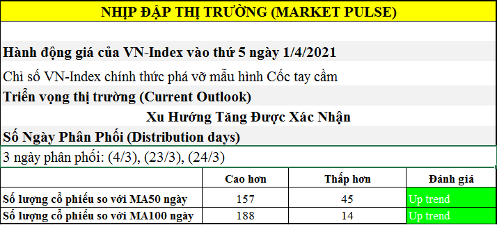 Thị trường vẫn đang ở trong xu hướng tăng với 3 phiên phân phối. Xu hướng tăng vẫn đang được xác nhận khi số lượng cổ phiếu nằm trên đường MA50 ngày vẫn đang gấp ba lần số lượng cổ phiếu nằm dưới MA50 ngày. Nhưng chú ý ở thời điểm hiện tại một số cổ phiếu dẫn dắt đã có dấu hiệu suy yếu sau một giai đoạn tăng giá dài. Trader cần thận trọng quan sát diễn biến thị trường chung và hành động giá của các cổ phiếu Leader để có thể chuẩn bị cho mình những kế hoạch giao dịch chủ động trong giai đoạn sắp tới.