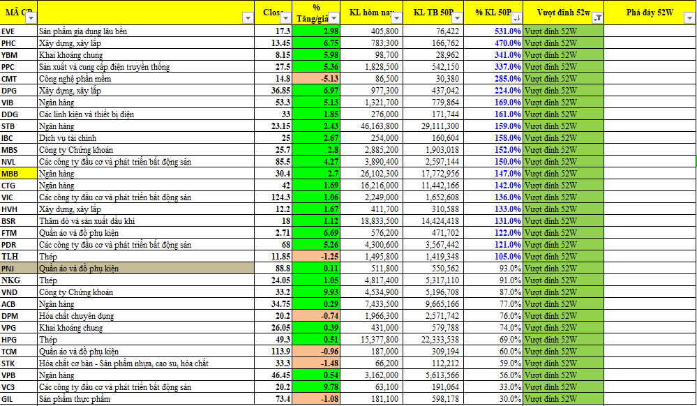 Danh sách Break đỉnh 52 tuần có tăng lên về mặt số lượng, nhưng trong bối cảnh thị trường tăng điểm mạnh nhưng chất lượng của danh sách này đang suy yếu khi khối lượng bùng nổ nằm ở những cái tên xa lạ chỉ được một số cổ phiếu như: VIB,STB,MBS,MBB,NVL,CTG …. là đáng chú ý.