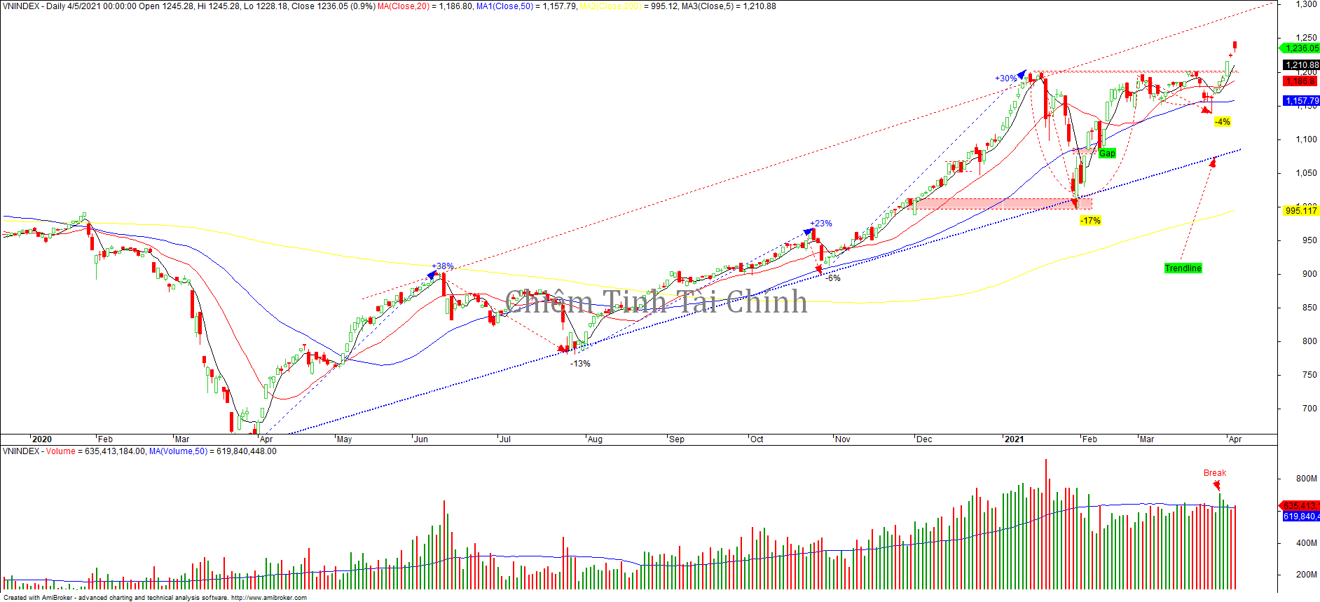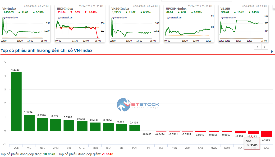 Kết thúc phiên giao dịch ngày 5/4/2021 chỉ số VNIndex đóng cửa ở mức 1,236.05, tăng 11.6, tương ứng tăng 0.95%. Thanh khoản thị trường đạt 635 triệu đơn vị. Thị trường tăng điểm với biên độ giao động mạnh, nhóm cổ phiếu ngân hàng, VIN, chứng khoán đang kéo thị trường tăng điểm mạnh. Thị trường phân hóa mạnh, nhiều cái tên khá quen thuộc trong thời gian qua tiếp tục làm kéo chỉ số tăng mạnh như: VCB,CTG,VIC,VHM….