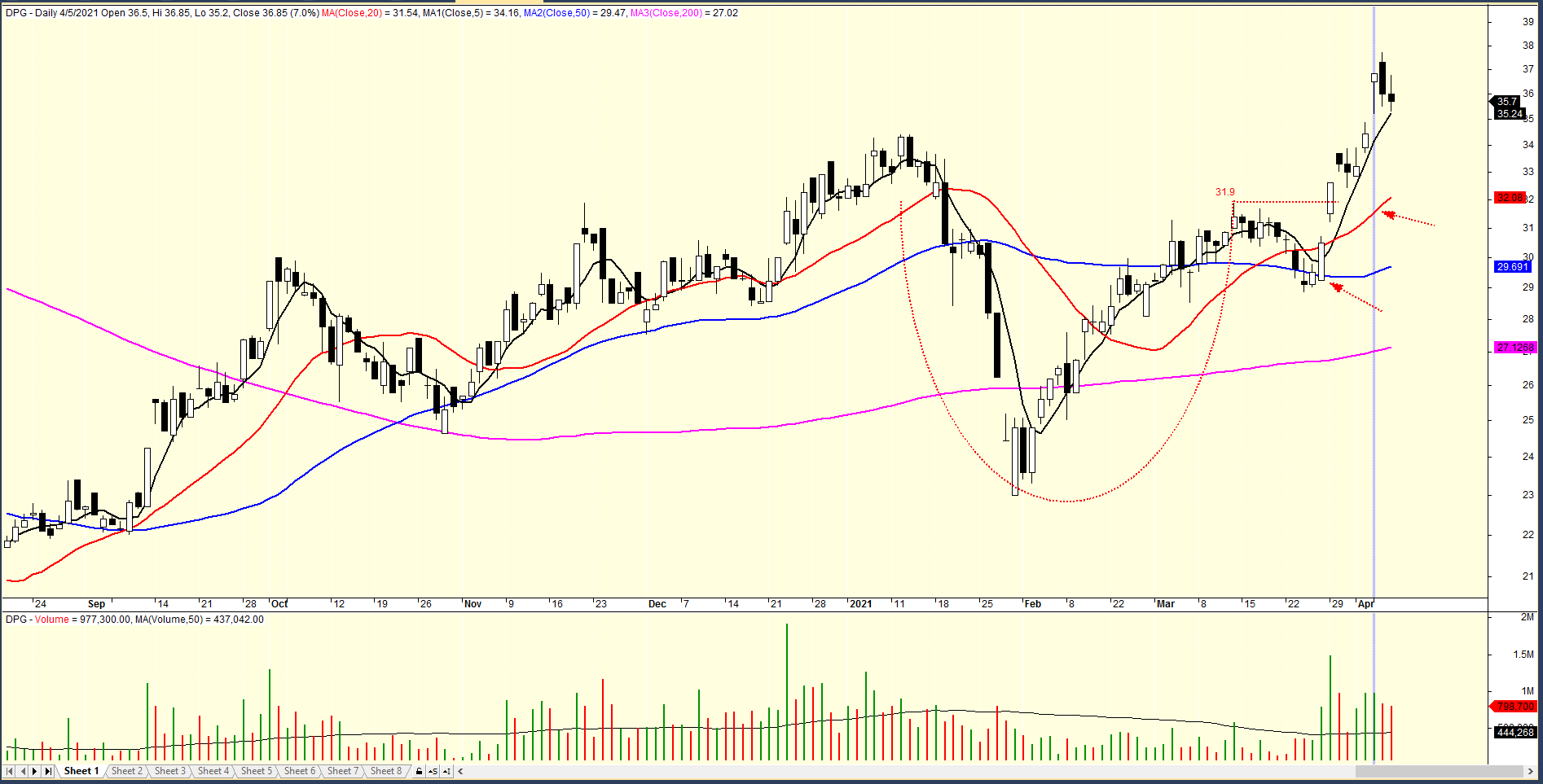 Cổ phiếu DPG sau khi Break mẫu hình cốc tay cầm, chúng tôi đã khuyến nghị khách hàng tham gia vào cổ phiếu khi cổ phiếu xuất hiện điểm mua sớm. Điểm mua Pocket ở dưới vùng 31.3 và “nhồi lệnh” khi cổ phiếu Break vùng 31.3. Hiện tại cổ phiếu đã tăng hơn 18% từ điểm mua. Bạn đọc có thể liên hệ chúng tôi để có thể nhận được những báo cáo phân tích về những cổ phiếu tốt nhất được cập nhật chi tiết sớm qua SĐT 0977.697.420