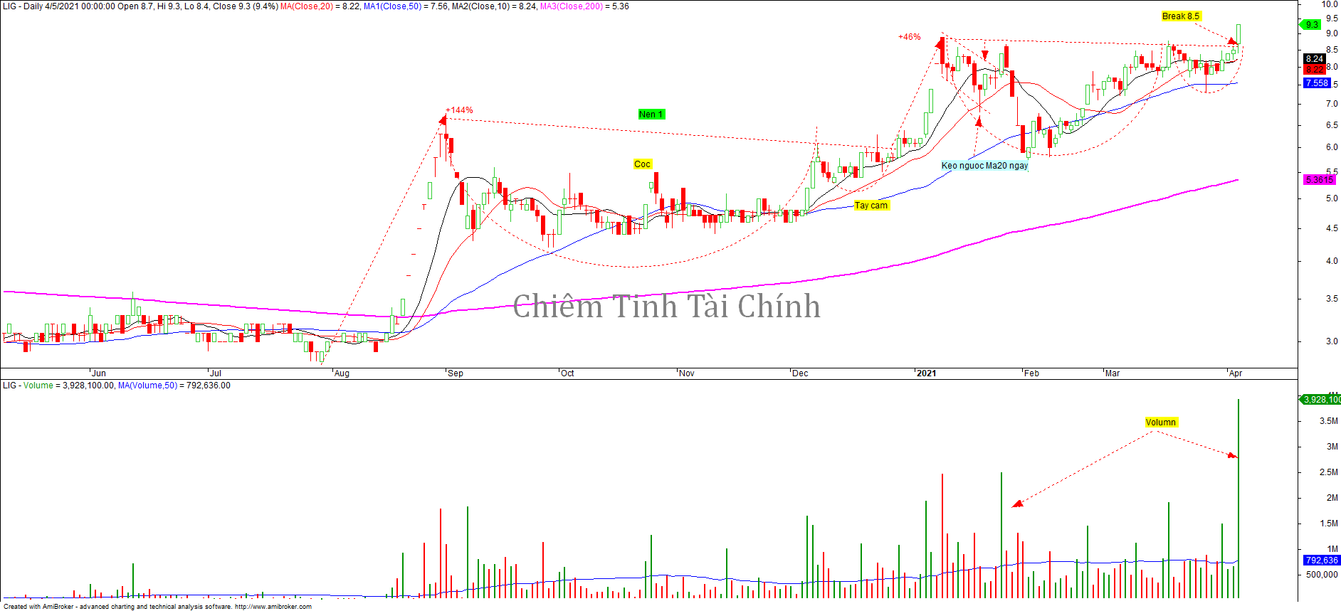 Cổ phiếu LIG break mẫu hình cốc tay cầm phiên ngày 5/4/2021 với khối lượng tăng mạnh gấp 3 lần bình quân 50 phiên và hành động giá đóng cửa cao nhất phiên. Bản phân tích LIG chúng tôi cũng đã gửi đến nhà đầu tư ở Room tư vấn. Hiện tại LIG đã qua điểm mua, tiếp tục nắm giữ LIG.