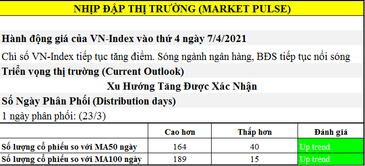 Thị trường hiện tại chỉ còn lại 1 phiên phân phối, với ngày phân phối ngày 4/3/2021 đã bị xóa bỏ khi chỉ số VN-Index vượt mốc 1227 điểm. Phiên phân phối ngày 23/3/2021 cũng sắp sửa hết hiệu lực khi chỉ số VN-Index chỉ cần tăng lên đóng cửa trên 1244 điểm vào ngày mai . Xu hướng tăng vẫn đang được xác nhận khi số lượng cổ phiếu nằm trên đường MA50 ngày vẫn ngày càng tăng cao hơn so với số lượng cổ phiếu nằm dưới MA50 ngày. Độ rộng thị trường đang được mở rộng hơn khi danh sách cổ phiếu vượt đỉnh 52 tuần đang ngày càng được gia tăng. Chúng tôi lại một lần nữa nhắc nhở trader cần trông coi danh mục của mình thật cẩn thận, đồng thời phải theo dõi diễn biến thị trường thật sát sao, đừng ngủ quên trên chiến thắng. Thị trường có thể đảo chiều bất cứ lúc nào, nhất là khi thị trường đang ngày càng tiến gần về ngày đảo chiều chiêm tinh 27/4/2021 +- 3 ngày giao dịch.
