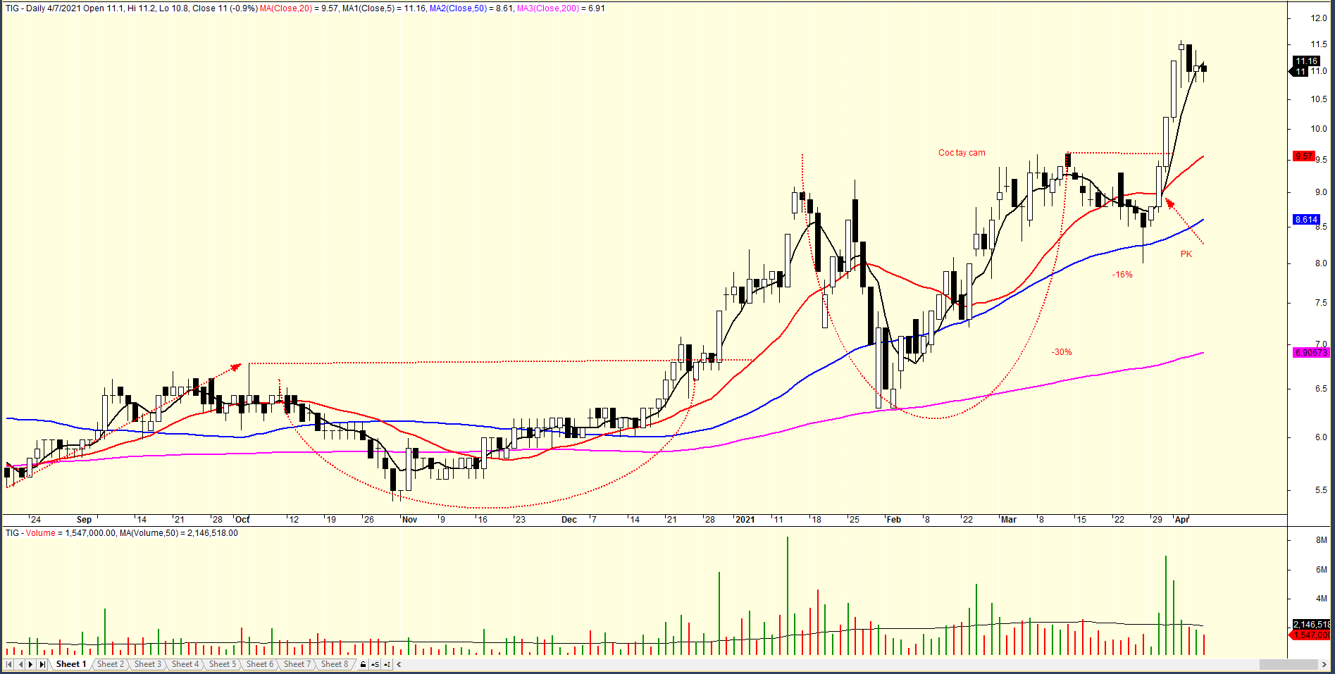 Sau cú tăng giá gần 20% sau điểm pivot, cổ phiếu TIG đang có giai đoạn nghỉ ngơi để lấy đà cho nhịp tăng sắp tới.