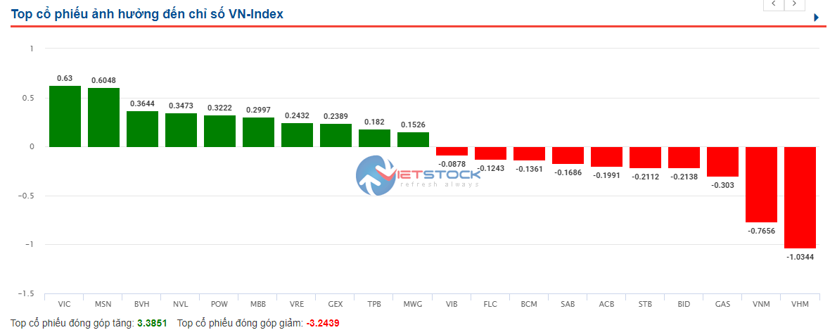 Chỉ số VN-Index tăng 0.19% với thanh khoản hôm nay đạt 676 triệu đơn vị, cao hơn so với phiên trước. Thị trường hôm nay lại tiếp tục tăng điểm với sự giúp sức của các cổ phiếu thuộc sóng ngành ngân hàng như MBB (+2.3%), TPB (+2.3%), ABB (+4.1%), NAB (+3.7%),… Đóng góp vào ngày tăng điểm của chỉ số VN-Index hôm nay cũng phải kể đến các cổ phiếu Blue Chips như BVH (+2.92%), NVL (+1.48%), VRE (+1.1%), MWG (+0.9%),.. Bên cạnh những công thần giúp thị trường chung tăng điểm thì cũng phải kể đến những tội đồ giảm điểm trong ngày hôm nay như VHM (-1.2%), VNM (-1.4%), GAS (-0.7%), STB (-2%) … Vẫn là một ngày HOSE lại tiếp tục đơ và lệnh không nhận được vào đầu phiên chiều ở các công ty chứng khoán lớn, chứng tỏ dòng tiền vẫn đang đổ vào rất mạnh khiến hệ thống bị nghẽn từ khá sớm. Các broker ở các công ty chứng khoán đang sống trong thời kỳ “vàng son” khi phiên giao dịch được kết thúc sớm ngay vào đầu phiên chiều khi hệ thống bị đơ.