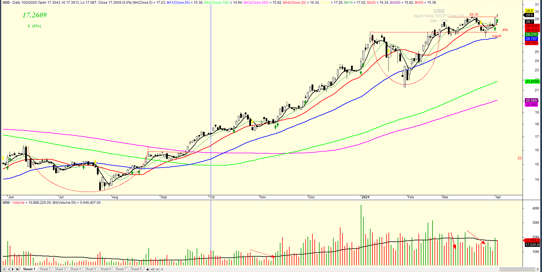 Sau điểm breakout mẫu hình Nền giá phẳng chồng lên CUP. Cổ phiếu MBB lại tiếp tục tăng giá cùng khối lượng lớn sau đó đem đến những tín hiệu tích cực cho các cổ đông nắm giữ cổ phiếu. Thông tin về điểm mua cổ phiếu MBB đã được chúng tôi đề cập ở bài viết trước, các bạn có thể đọc lại tại: