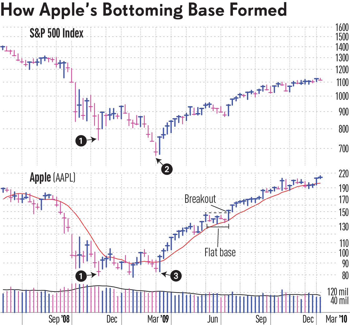 Sau 9 tuần bị bán tháo, chỉ số SP500 giảm 28%. Nó phá thủng đáy 52 tuần ở mức 741 điểm vào tháng 11 năm 2008 (điểm số 1). Trong tuần kết thúc ngày 21 tháng 11, Apple cũng chạm đáy thấp tại 79.14. Nhà sản xuất Iphone rớt 61% kể từ đỉnh cao mọi thời đại 202.96. 8 tuần sau đó, Apple tiếp tục kiểm tra lại đáy này.