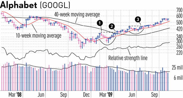 Nhưng Google đã hình thành một loại mẫu hình khác sau khi các chỉ số thị trường đã xác nhận xu hướng tăng mới vào tháng 3 năm 2009 (ND: Bằng ngày Bùng Nổ Theo Đà). Vào giữa tháng 4-2009, Alphabet (GOOGL) đã tạo ra một nền giá tạo đáy (bottoming Base) với điểm mua 381.10. Mẫu hình Chiếc Cốc hình thành sau khi Nasdaq rớt 43% vào năm 2008 do cuộc khủng hoảng nợ dưới chuẩn.