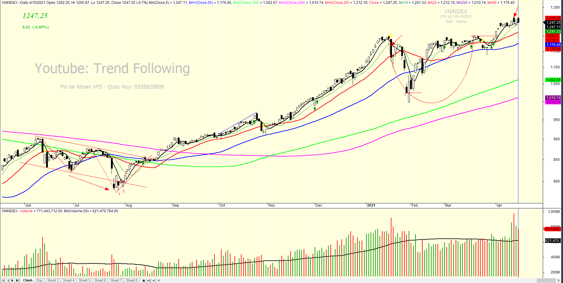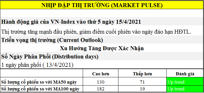 Thị trường vẫn đang ở trong xu hướng tăng với một ngày phân phối mạnh 13/4/2021. Đây là phiên phân phối mạnh với khối lượng giao dịch đạt mức kỷ lục 977 triệu cổ kể từ khi xu hướng tăng giá bắt đầu. Chúng tôi lại phải cảnh báo các Trader nên thật sự tỉnh táo trong giai đoạn này vì thị trường đã có những dấu hiệu suy yếu xuất hiện. Độ rộng thị trường vẫn đang dần bị thu hẹp khi danh sách cổ phiếu vượt đỉnh 52 tuần đang ngày càng ít đi so với các phiên giao dịch trước. Thị trường có thể đảo chiều bất cứ lúc nào, nhất là khi thị trường đang ngày càng tiến gần về ngày đảo chiều chiêm tinh 27/4/2021 +- 3 ngày giao dịch.