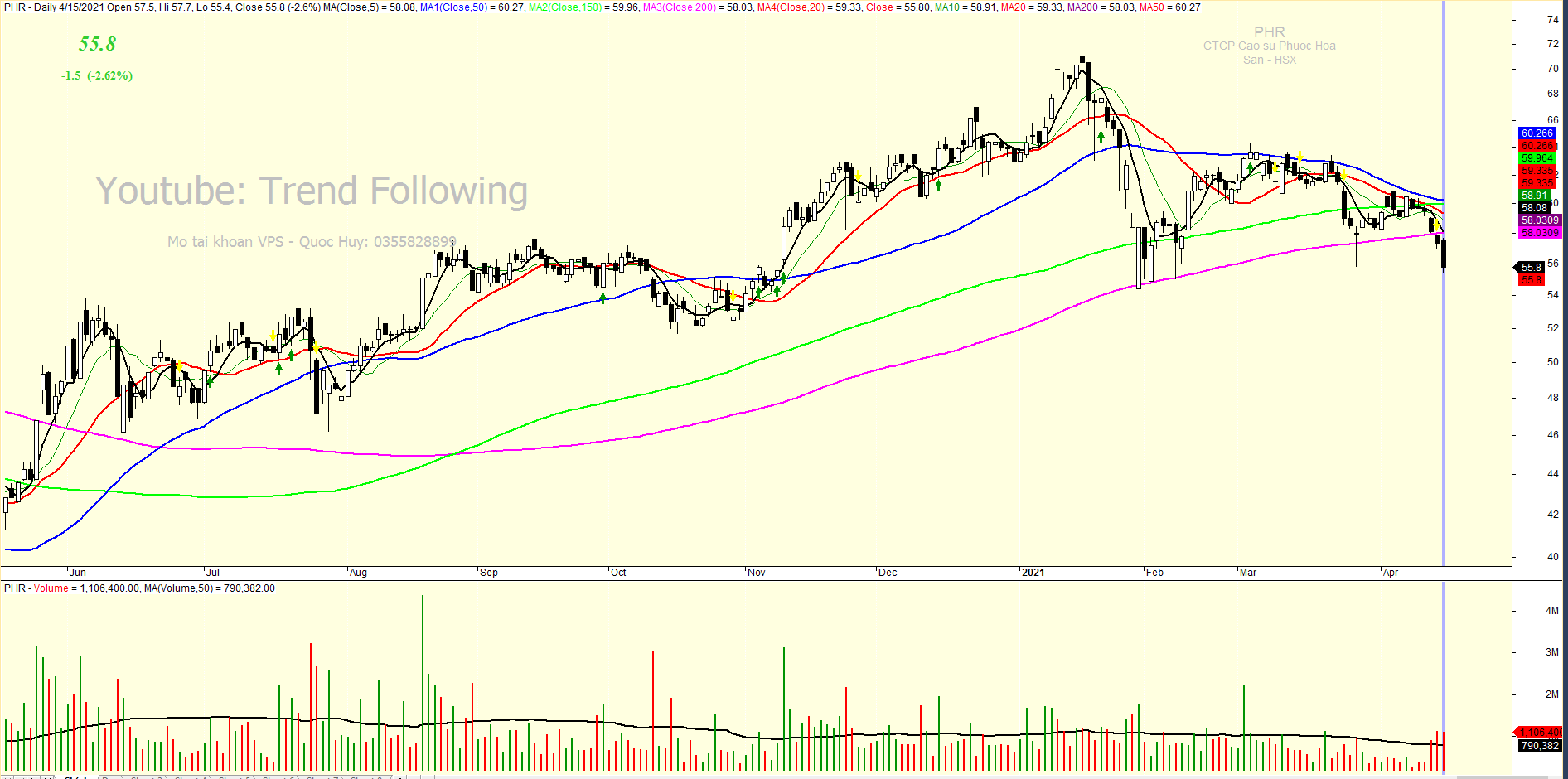 Cổ phiếu PHR cũng thuộc sóng ngành BĐS KCN, gãy đường xu hướng dài hạn MA200 ngày với khối lượng lớn.
