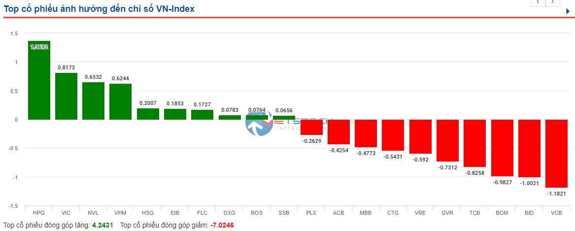 Chỉ số VN-Index giảm -0.69% với thanh khoản hôm nay đạt 771 triệu đơn vị thấp hơn so với phiên giao dịch trước. Hôm nay, trò chơi tàu lượn lại một lần nữa bắt đầu khi thị trường mở cửa bằng một Gap up tăng giá tạo đà hưng phấn cho toàn bộ thị trường. Nhưng niềm vui chưa kịp tận hưởng bao lâu thì ngay sau 10 giờ, cú “quay đầu xe” của chỉ số VN-Index khiến nhiều nhà đầu tư choáng váng khi không hiểu chuyện gì đang xảy ra ở thời điểm hiện tại. Áp lực của ngày đáo hạn Hợp đồng tương lai phái sinh đã khiến đã khiến cho một số cổ phiếu trong rổ VN30 có ngày giảm điểm khá mạnh như VCB (-1.2%), BID (-2.2%), TCB (-2.2%), VRE (-2.9%), TPB (-2.9%),… Dòng thép hôm nay phải gọi là xứng vai anh hùng khi đã có ngày tăng giá khá mạnh mẽ, đóng vào việc ngăn đà giảm điểm của thị trường tiêu biểu như HPG (+2.8%), HSG (+5.3%), NKG (+2.6%), TLH (tăng trần 6.8%),….
