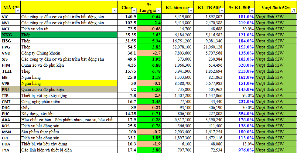 Theo dữ liệu của chúng tôi, chỉ còn 23 mã cổ phiếu thiết lập đỉnh 52 tuần trong ngày hôm nay trong đó có 2 mã cổ phiếu phá đáy, cho thấy danh sách vượt đỉnh 52 tuần đang thu hẹp lại (Tuần trước có đến 32 mã vượt đỉnh 52 tuần). Nhìn vào số cổ phiếu vượt đỉnh 52 tuần thì nổi bật nhất là Sóng ngành Thép, bất động sản, ngân hàng đang là những ngành có lượng cổ phiếu vượt đỉnh nhiều nhất. Chứng tỏ đây là những dòng mạnh nhất so với thị trường ở thời điểm hiện tại.