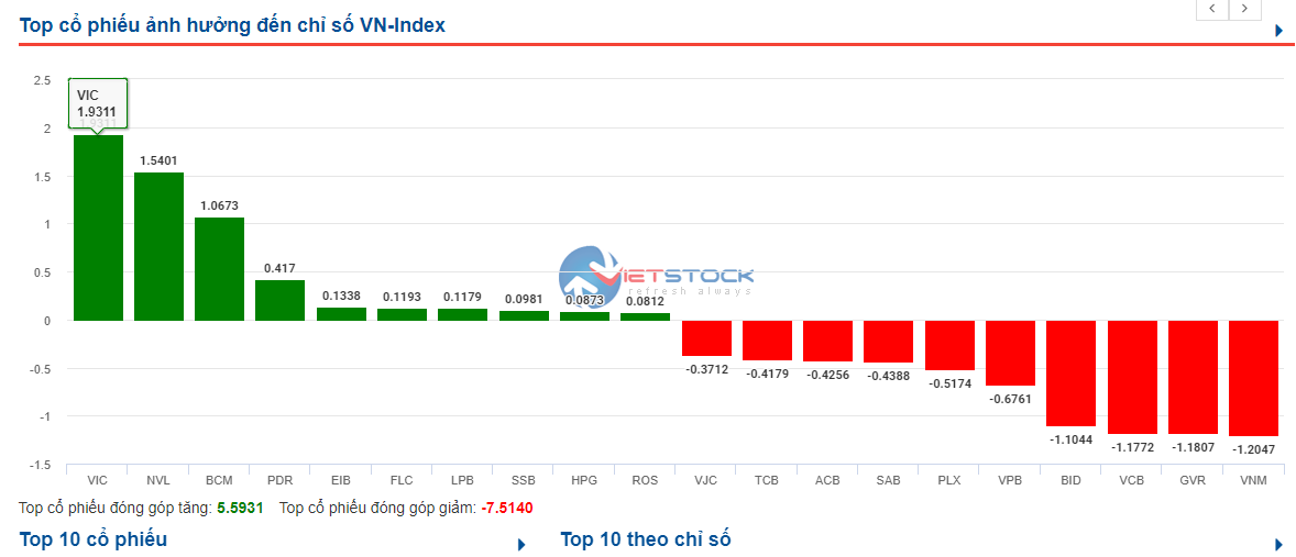 Chỉ số VN-Index giảm -0.69% với thanh khoản hôm nay đạt 948 triệu đơn vị cao hơn so với phiên trước, đáp ứng tiêu chí phân phối. Thị trường chung hiện tại xuất hiện 2 phiên phân phối mạnh đồng thời chúng ta đang quan sát thấy sự suy yếu đến từ các cổ phiếu dẫn dắt và sự tăng giá mạnh mẽ đến từ các cổ phiếu Penny. Đây là dấu hiệu cảnh báo chúng ta đang ở rất gần với đỉnh chứng khoán. Hôm nay áp lực giảm điểm chủ yếu đến từ việc bán ròng của khối ngoại ở các cổ phiếu VNM (-2.2%), GVR (-4.3%), VCB (-1.2%), BID (-2.4%), VPB (-2.1%)… Bên cạnh đó thị trường cũng được nâng đỡ bởi nhóm cổ phiếu VIC (+1.5%), NVL (+5.4%), PDR (+5%), EIB (+1.6%), HPG (+0.2%),.. giúp ngăn đà giảm cho chỉ số VN-Index trong một ngày khối lượng giao dịch gia tăng đột biến. Đây là khoảng thời gian mà các Trader nên bóp chặt stoploss, giảm tỷ trọng đầu tư trong giai đoạn này và quan sát thị trường cùng danh mục cổ phiếu của mình một cách cẩn thận.