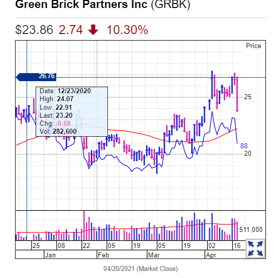 Công ty xây dựng nhà ở, Green Brick Partners (GRBK) giảm 11% trong một tuần lầ một vị dụ. Phải thừa nhận rằng, nền giá đã bắt đầu hình thành trong tháng 11 không phải là một mẫu hình chiếc cốc chuẩn. Nó thiếu đi tính đối xứng. Cổ phiếu này đã có một khoảng thời gian dài nằm dưới MA50 ngày. Chưa kể Green Brick có những phiên tăng giá mạnh với khối lượng lớn trong hai tuần cuối của tháng ba. Cổ phiếu vốn hóa nhỏ này đã vượt qua điểm mau 25.15. Nhưng sau đó nhanh chóng rớt trở lại. Đây là lúc bạn cần ứng dụng quy tắc cắt lỗ 7%-8% để đảm bảo an toàn khi giao dịch ở các cổ phiếu tăng trưởng. Khi bạn cảm thấy thị trường biến động quá khó lường, thì mục tiêu chốt lãi 20%-25% nên dideuf chỉnh thành 10%-15% từ điểm breakout nền giá, và thu hẹp mức cắt lỗ xuống còn 3%-5%. Điều này sẽ đảm bảo tỷ lệ lợi nhuận/rủi ro là 3:1