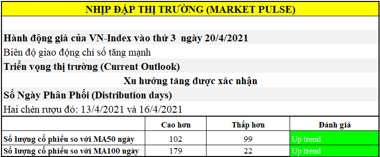 Về hành động giá của VNIndex vẫn chưa có bình luận mới. Có thể phiên giao dịch ngày 20/4/2021 là sự sang tay của những nhà đầu tư yếu cho những nhà đầu tư mạnh hay nói cách khá là sự chốt lãi của những nhà đầu tư đã tham gia ở 6 phiên trước. Nền giá kiến tạo vẫn đang hoạt động tốt, như đã bóc tách những tác động của nhóm Bluchips đến chỉ số VNIndex thì nhóm cổ phiếu có xu hướng tăng vẫn áp đặt nhóm xu hướng giảm. Dòng tiền vẫn tập trung ở nhóm cổ phiếu Bluchips và nhóm cổ phiếu có kết quả kinh doanh quý 1 tốt chứ không lan tỏa. Nếu thị trường không tăng mạnh thì 2 nhóm này vẫn hoạt động tốt về mức tăng điểm, nhà đầu tư có thể lên danh sách những cổ phiếu có kết quả kinh doanh quý 1 tốt và chuẩn bị break mẫu hình để lên chiến lược mua vào. Đặc biệt ở những cổ phiếu tăng trưởng.