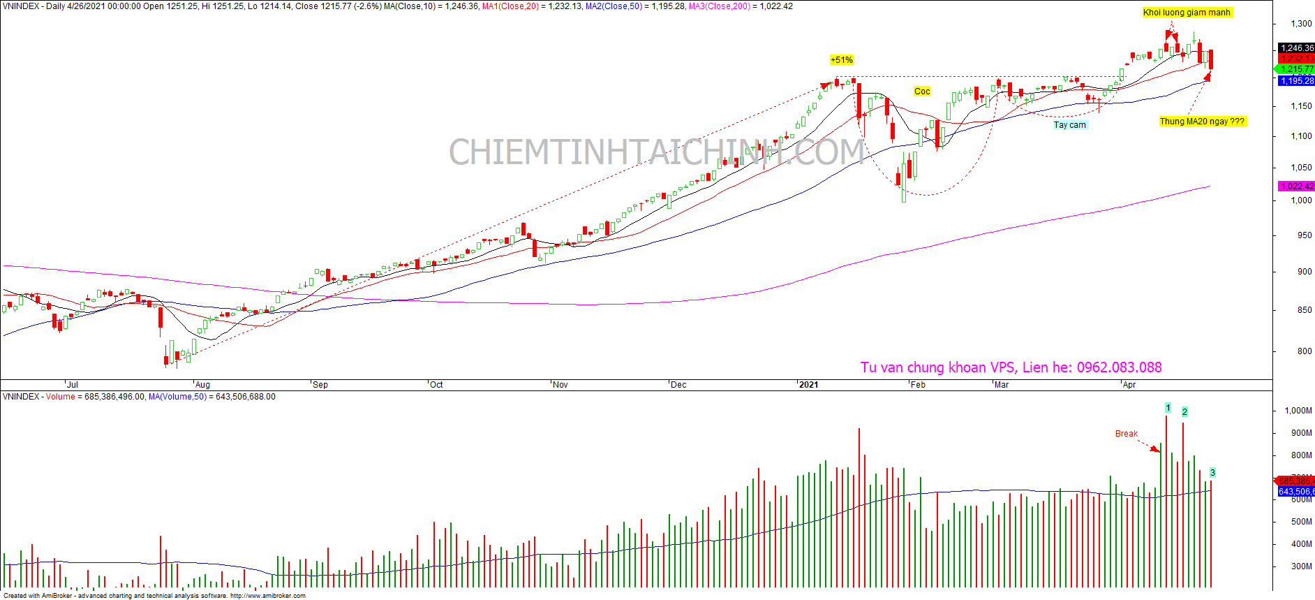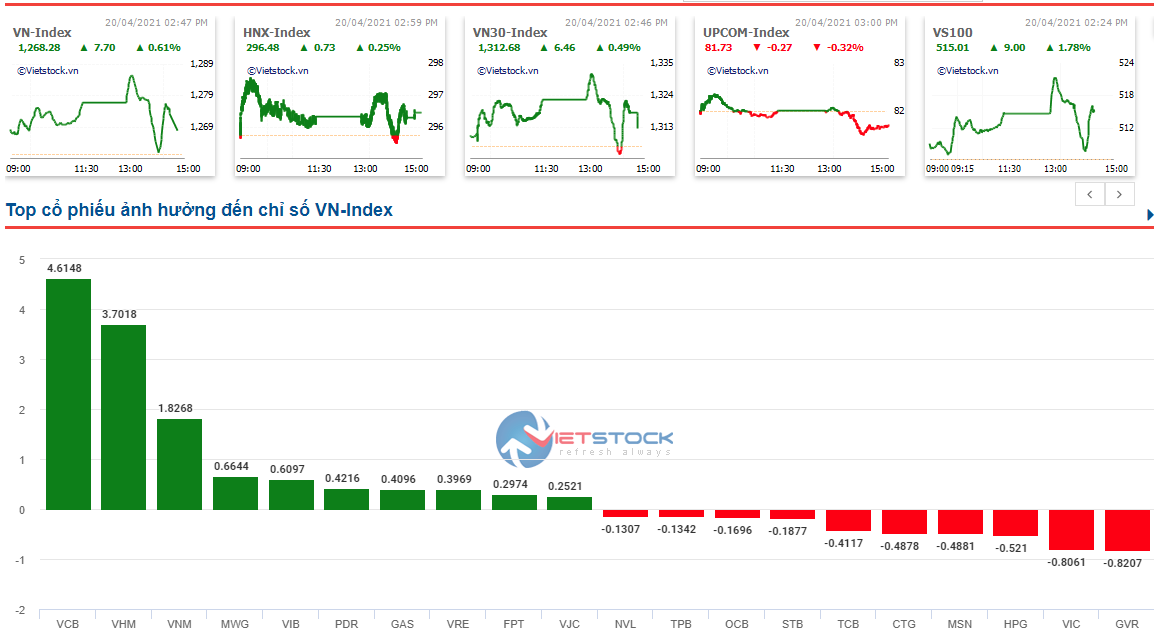 Kết thúc phiên giao dịch ngày 20/4/2021 chỉ số VNIndex đóng cửa ở mức 1,268.28 điểm, tăng 7.7 điểm, 0.61%. Thanh khoản thị trường đạt hơn 798 triệu đơn vị, thấp hơn phiên ngày 19/4/2021. Độ biến động của thị trường phiên hôm nay biến động mạnh, chênh nhau giữa giá cao nhất và thấp nhất trong phiên lên đến 25 điểm. Bản chất của độ biến động này đến từ những cổ phiếu vốn hóa lớn như VHM,VCB,VNM đã làm thị trường biến động hơn 10 điểm, chưa tính đến những cổ phiếu khác như: GAS, VRE, FPT . Nhóm ngành ngân hàng vẫn đang phân hóa tăng giảm trái chiều, đây là nhóm kéo đà tăng của thị trường. Điều quan trọng hơn là tâm lý bất ổn của nhà đầu tư: Lúc chỉ số tăng thì hưng phấn mua bằng mọi giá, lúc đảo chiều thì bán bất chấp.