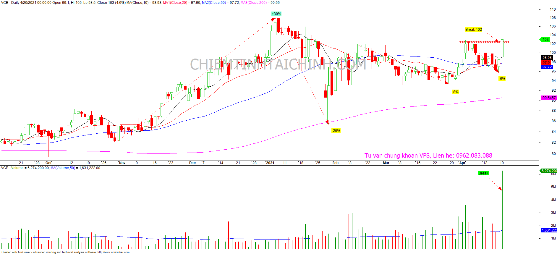 Cổ phiếu VCB break mẫu hình VCB với 3 lần thu hẹp lần lượt : -20%, -8%,-6% và break vùng 102 với khối lượng tăng mạnh gấp 4 lần bình quân 50. Nhóm ngành ngân hàng vẫn là nhóm ngành nâng đỡ thị trường, tuy nhiên nhóm này vẫn chưa có đồng thuận, nhưng nhóm này luân phiên giữ xu hướng thị trường.