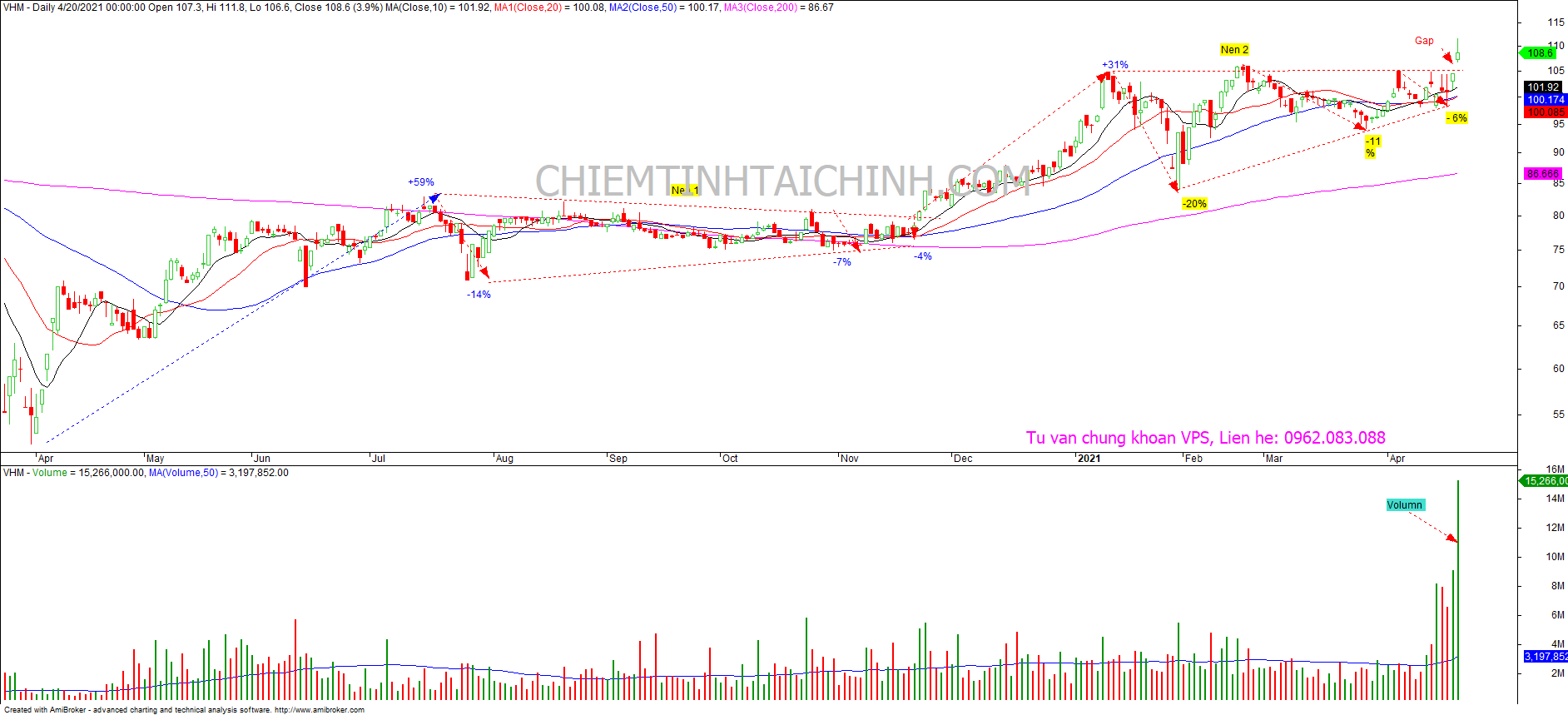 Cổ phiếu VHM cũng break mẫu hình VCP với 3 lần thu hẹp lần lượt : -20%, -11%, -6% đồng thời mở Gap up tăng điểm. Khối lượng Break gấp 5 lần bình quân 50 phiên, hiện tại nhóm ngành bất động sản cũng đang có sóng ngành và VHM được đánh giá là cổ phiếu dẫn dắt của nhóm này về thị phần, chất xúc tác….. Chi tiết cổ phiếu đội ngũ chúng tôi sẽ gửi đến khách hàng bản phân tích chi tiết.