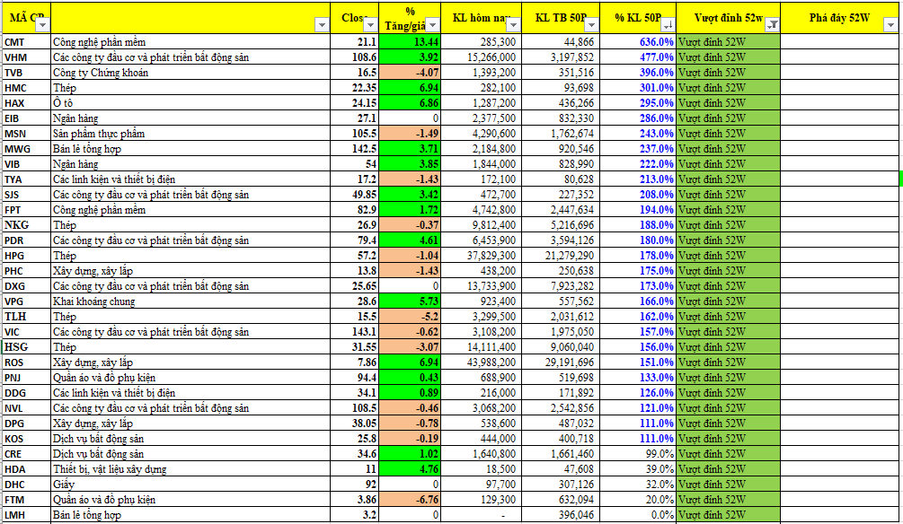 Danh sách cổ phiếu vượt đỉnh 52 tuần chủ yếu tập trung ở các cổ phiếu nhóm: Ngân hàng, thép và bất động sản là chủ yếu.