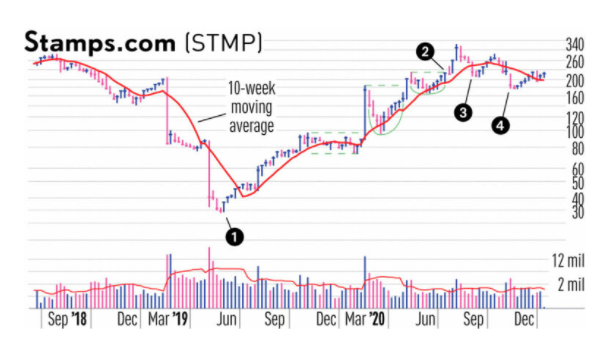 Cỏ phiếu Stamp.com bắt đầu một sóng chạy mạnh sau khi chạm mức đáy 32.54 vào tháng 5 năm 2019 (điểm đánh dấu số 1). Nhà cung cấp sản dịch vụ vận chuyển và thư tín dựa trên internet này đã chạm đáy thấp sau khi chấm dứt vai trò đại lý với United States Postal Service vào tháng 2 năm 2019.