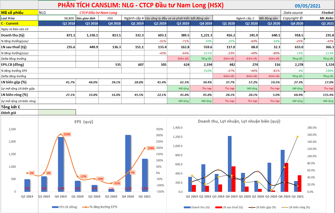 NLG không đáp ứng tiêu chí chữ A nhưng lại đáp ứng tiêu chí chữ C trong mô hình CANSLIM. Cụ thể, NLG có sự tăng tốc trong trưởng lợi nhuận, biên lợi nhuận ròng mở rộng trong 3 quý liên tiếp. -> Mô hình CANSLIM của chúng tôi tập trung vào chữ C hơn là chữ A.
