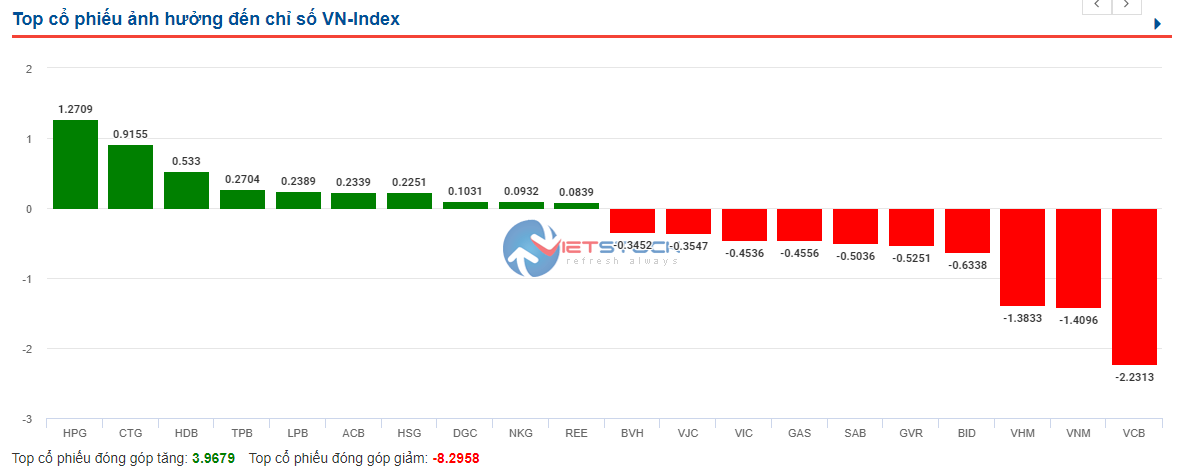 Chỉ số VN-Index giảm 0.71% với thanh khoản hôm nay đạt 745 triệu đơn vị, thấp hơn so với phiên trước. Thị trường hôm nay lại xuất hiện thêm một phiên phân phối với áp lực giảm điểm khá mạnh đến từ hai mã cổ phiếu có vốn hóa lớn đó là VNM và SAB. Trong đó nổi bật nhất hôm nay của phe Gấu đó là VNM với ngày giảm điểm -2.9% cùng với thanh khoản gần gấp đôi KLGD BQ 50 phiên và SAB (giảm -1.93%) với thanh khoản lớn hơn KLGD BQ 50 phiên . VNM và SAB đang rơi vào xu hướng giảm giá dài hạn khi đã bẻ gãy đường xu hướng dài hạn MA200 ngày. Chúng tôi muốn nhắc nhở các nhà đầu tư tránh việc bắt đáy những cổ phiếu khi đã gãy xu hướng dài hạn để tránh dính phải những khoản lỗ lớn. Hãy đầu tư tập trung vào danh sách những cổ phiếu nằm trên đường MA200 ngày đang dốc lên để có thể kiếm được tỷ suất sinh lợi cao nhất. Sóng ngành ngân hàng lại tiếp tục xuất hiện những cổ phiếu tăng giá ấn tượng đó là CTG (+2.1%), HDB (+4.2%), LPB (+3.8%), ACB (+1.1%). Cổ phiếu ngành thép cũng tiếp tục vượt đỉnh với sự góp mặt của những cái tên tiêu biểu như: HPG (+2.4%), HSG (+5.2%), NKG (+6.8%), TLH (+5.8%),..