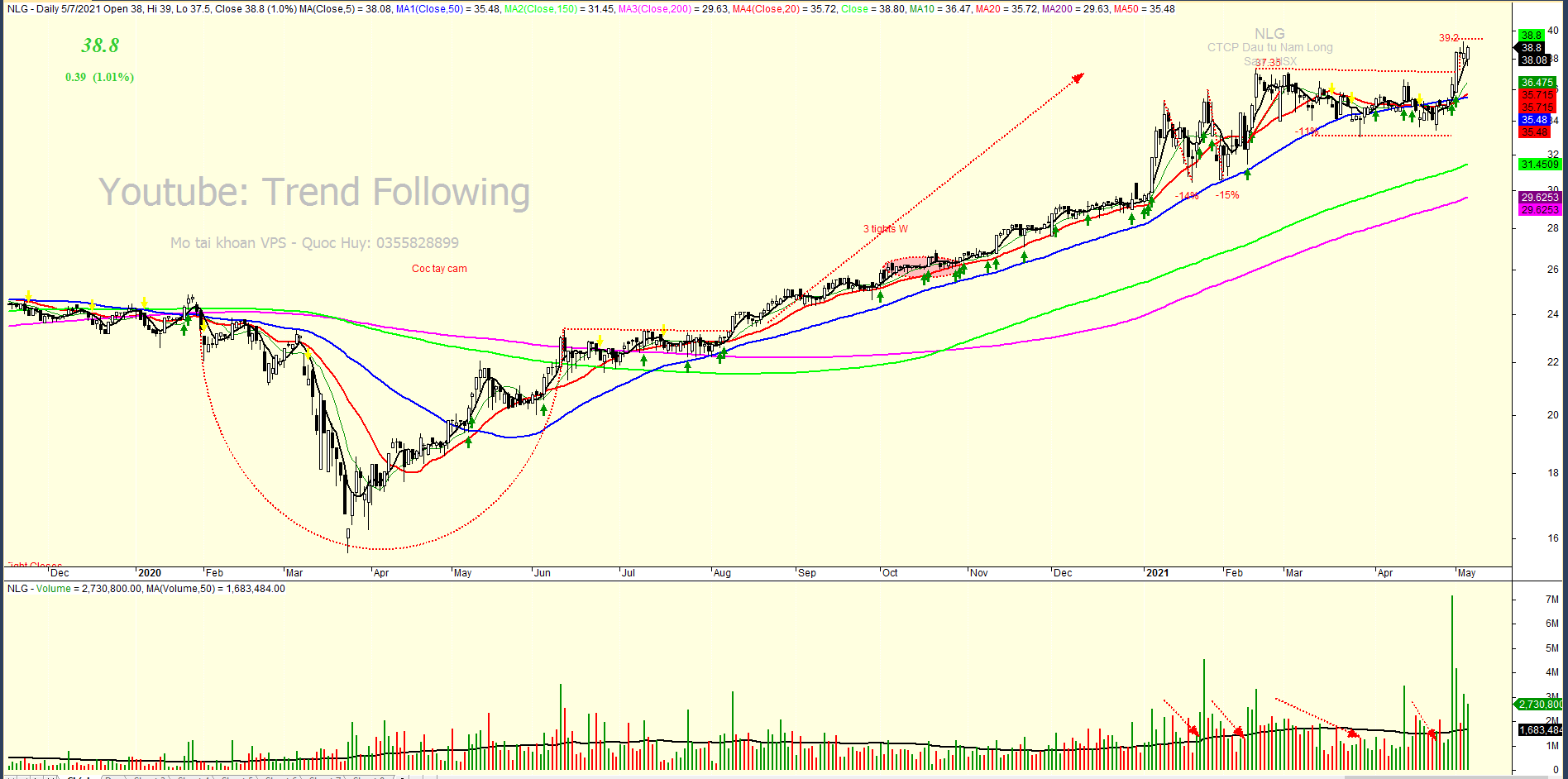 Theo mô hình giao dịch CANSLIM, cổ phiếu NLG có điểm mua Pocket Pivot vào ngày 29/4/2021 với khối lượng “lớn nhất” trong vài năm trở lại đây. Ngày 4/5/2021, cổ phiếu breakout mẫu hình Nền giá phẳng hình thành trong 10 tuần. Hiện tại, NLG đang thuộc nền giá số 2. Cổ phiếu vẫn đang vùng mua hợp lý 5% từ điểm pivot mẫu hình. Lưu ý: khi giá tăng vượt quá 39.2 thì không mua rượt đuổi đối với cổ phiếu này.