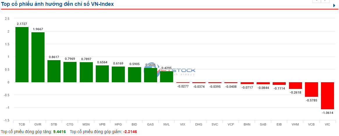 Chỉ số VN-Index tăng 1.03% với thanh khoản hôm nay đạt 664 triệu đơn vị, thấp hơn so với phiên trước. Thị trường hôm nay tăng điểm nhờ sự bứt phá của sóng ngành ngân hàng tiêu biểu như những cái tên STB (tăng trần 6.9%), TCB (+4.8%), LPB (+2.5%), CTG (+1.8%), MBB (+1.5%),… Các cổ phiếu có vốn hóa lớn cũng có ngày tăng giá khá tốt như GVR, MSN, HPG, mặc cho thị trường đầu phiên giảm khá mạnh do ảnh hưởng của đà giảm điểm tối qua của chỉ số Dow Jones. Bên cạnh những anh hùng giúp thị trường có ngày tăng điểm, chúng ta không thể không nhắc đến những tội đồ làm hãm đà tăng giá mạnh mẽ của chỉ số Vn-Index đó là VIC (-0.9%), VCB dù thuộc sóng ngành ngân hàng đang nổi sóng nhưng vẫn không tăng nổi (-0.62%), VHM (-0.3%),… đa số các mã giảm đều đi kèm với khối lượng thấp nên cũng chưa có gì để lo lắng.
