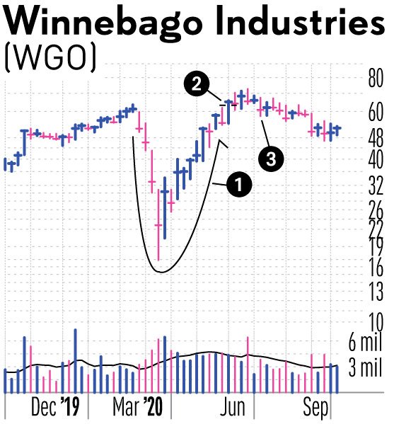 Vào tháng 6 năm 2020, Winnebago (WGO) đã có một đợt bán tháo mạnh do cú sập đổ Covid vào tháng 2 năm ngoái. Nhưng điều này này tạo ra mẫu hình Chiếc Cốc-Tay Cầm sâu hình thành trong khoảng thời gian 3 tháng (Điểm số 1).