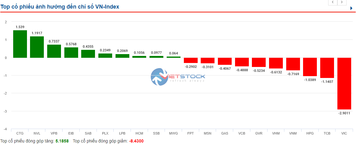 Chỉ số VN-Index giảm 0.56% với thanh khoản hôm nay đạt 680 triệu đơn vị, cao hơn so với phiên trước. Thị trường lại xuất hiện thêm một phiên phân phối. Thị trường hôm nay giảm điểm chủ yếu đến từ các cổ phiếu thuộc rổ VN30 như VIC (-0.9%), TCB (-2.5%), HPG (-1.9%), VNM (-1.4%), VHM (-0.7%),.. Giữa một màu đỏ của thị trường hôm nay vẫn còn xuất hiện những cổ phiếu tăng điểm góp phần ngăn đà giảm sâu của thị trường kể đến như CTG (+3.3%), NVL (+3.1%), VPB (+1.7%), LPB (+3.2%),.. Hầu hết tâm điểm của ngày hôm nay đều đến từ các cổ phiếu thuộc  nhóm ngành Ngân hàng với đà tăng vô cùng mạnh mẽ, thiết lập những đỉnh cao mới.