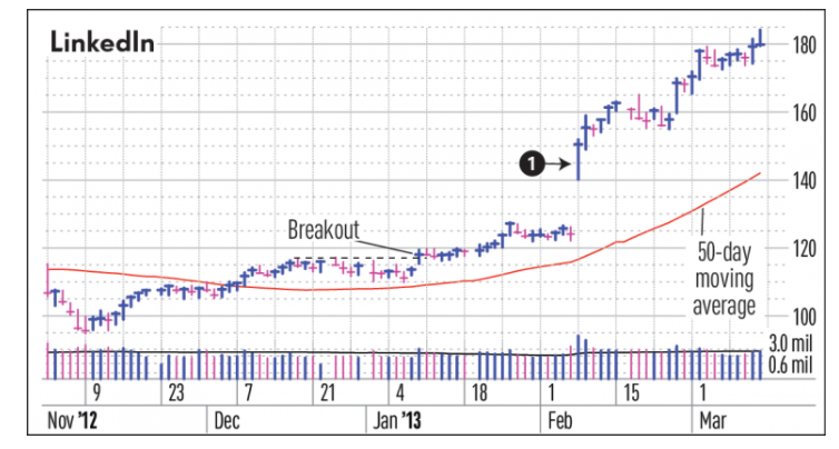 Vào ngày 10 tháng 1 năm 2013, Linkedln có điểm phá vỡ mẫu hình chiếc cốc tay cầm kinh điển hình thành trong 16 tuần, với điểm mua tại 117.42. Điểm tích cực của nền giá này bao gồm 6 tuần tăng giá liên tiếp ở phía bên phải nền giá và có mẫu hình 3 tuần giá đóng cửa thắt chặt bên trong tay cầm (xem chi tiết mẫu hình này trong cuốn sách Hướng Dẫn Thực Hành Canslim). Trong quý gần nhất, lợi nhuận và doanh số lần lượt tăng vọt 267% và 81% so với cùng kỳ năm trước.
