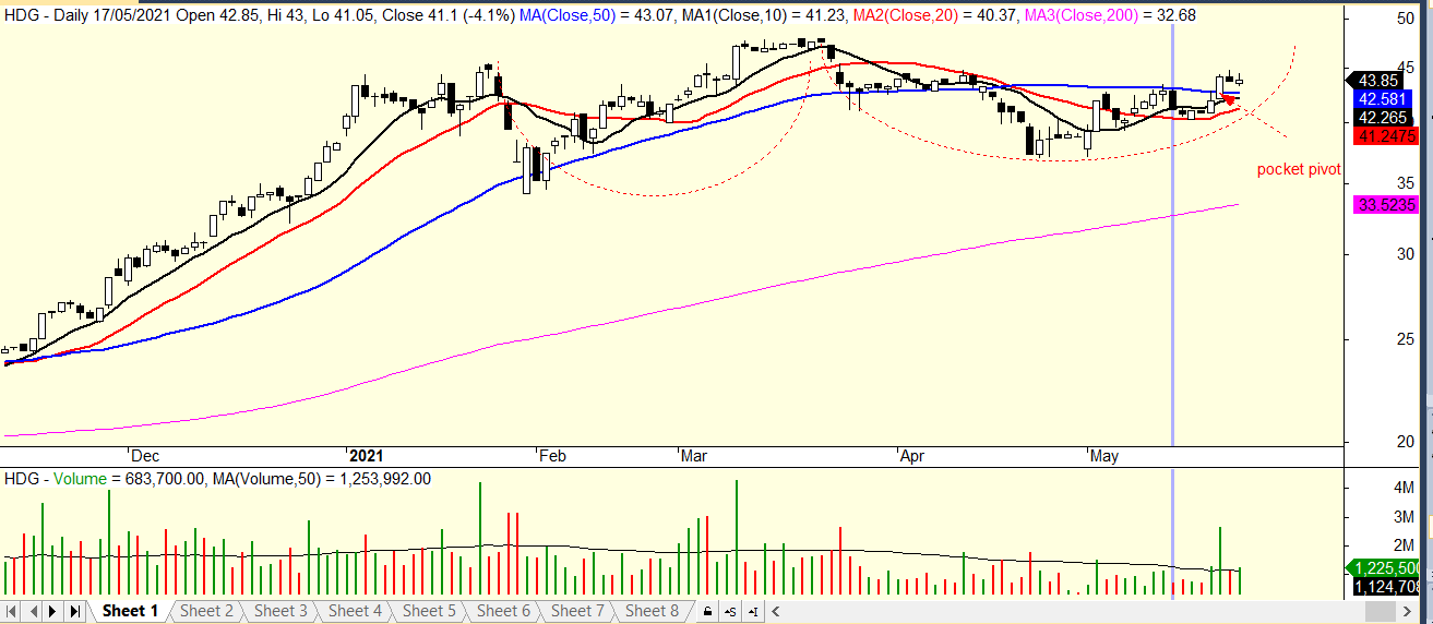 Theo mô hình giao dịch CANSLIM, chúng mở mua tỷ trọng 5% NAV khi HDG xuất hiện tín hiệu mua Pocket Pivot vào ngày 24/5/2021. Mẫu hình mà chúng tôi đang theo dõi ở cổ phiếu này là Cốc chồng Cốc. Hiện tại, HDG đang ở nền giá số 2.