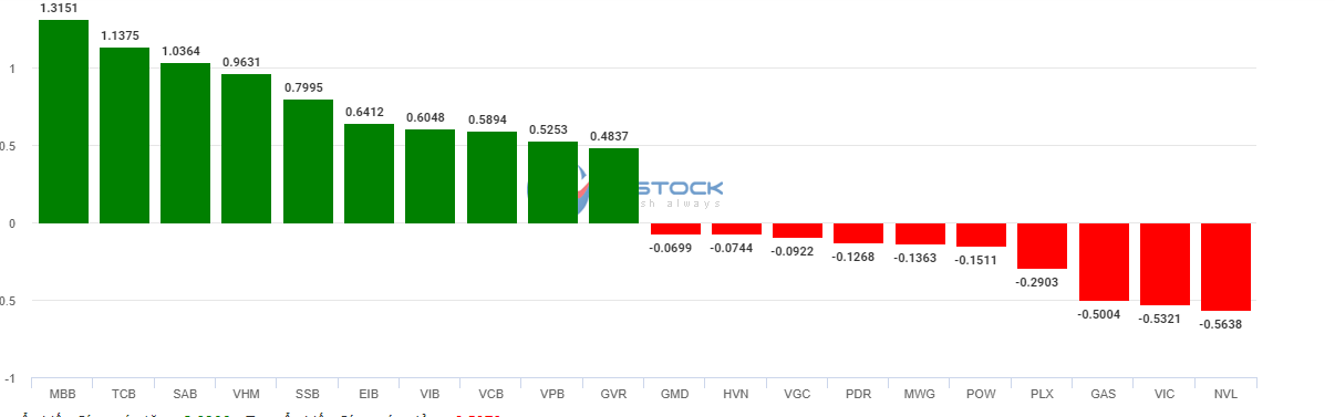 Chỉ số VN-Index tăng 0.6% với thanh khoản hôm nay đạt 676 triệu đơn vị, cao hơn so với phiên trước. Tiếp nối đà tăng giá của phiên giao dịch ngày 25/5/2021, chỉ số VN-Index đã có 5 phiên liên tiếp tăng giá sau tín hiệu Bounce mà chúng tôi đề cập ở các bài viết trước. Thị trường tăng điểm hôm nay đa phần đều do các cổ phiếu thuộc nhóm ngành ngân hàng kéo như MBB (+4.7%), TCB (+2.3%), EIB (+6.9%), TPB (+2.4%),…Các cổ phiếu như NVL, VIC, GAS, PLX,.. giảm điểm với khối lượng tương đối thấp cho thấy đây là một điều không đáng lo ngại. Dòng tiền hôm nay đã chứng minh sự mạnh mẽ của mình nó khi lan tỏa hầu hết các ngành như thép, ngân hàng, bất động sản, hóa chất, bán lẻ…. càng minh chứng cho niềm tin vững chắc việc chỉ số VN-Index sẽ còn tăng lên cao hơn nữa.