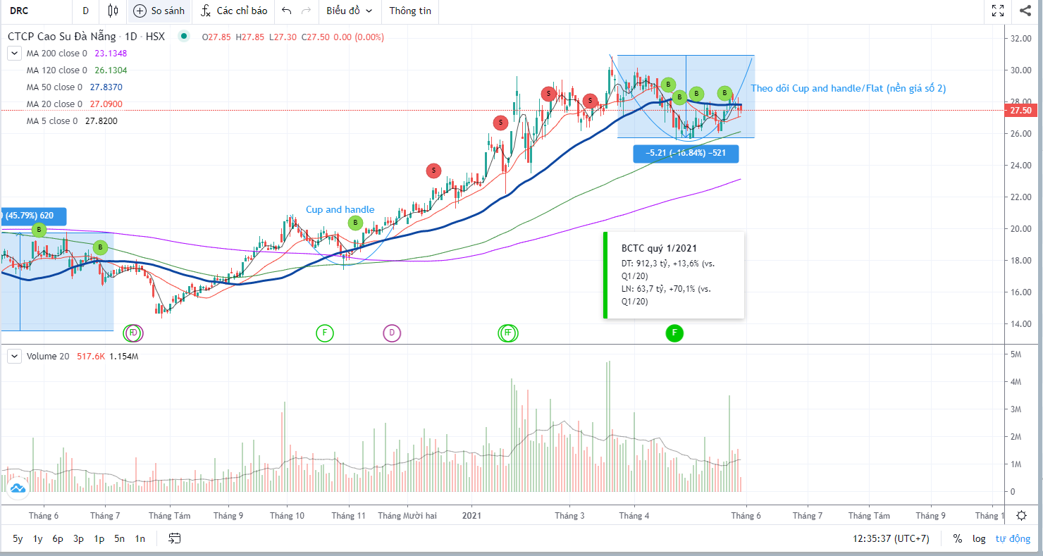 Trên đồ thị giá, DRC đang thiết lập nền giá số 2, cố thể dạng Flat Base hoặc Cup and handle. ĐỘ sâu 17% nên tôi nghiêng về Cup and handle nhiều hơn. Chi tiết liên hệ Room Nhà Đầu tư Canslim (zalo 0977697420)