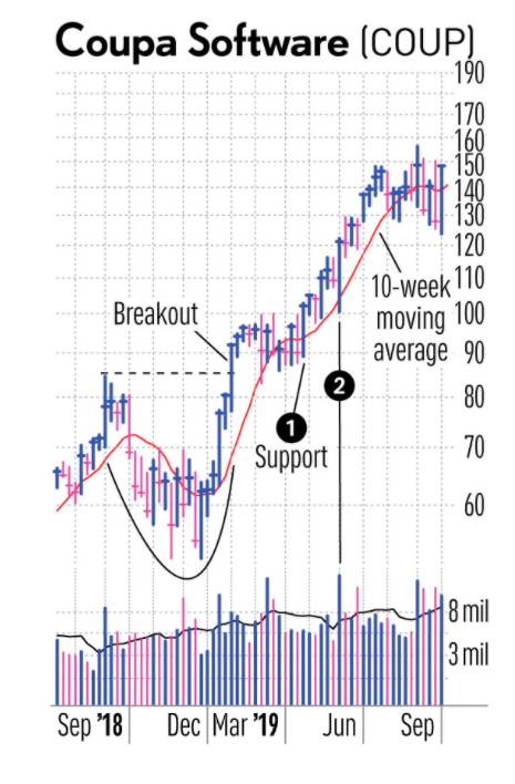 Coupa Software (COUP), một cổ phiếu dẫn dắt trong ngành công nghiệp phần mềm, tìm thấy hỗ trợ tại quanh MA50 ngày sau điểm phá vỡ (breakout) từ nền giá CUP vào tháng 1 năm 2019.